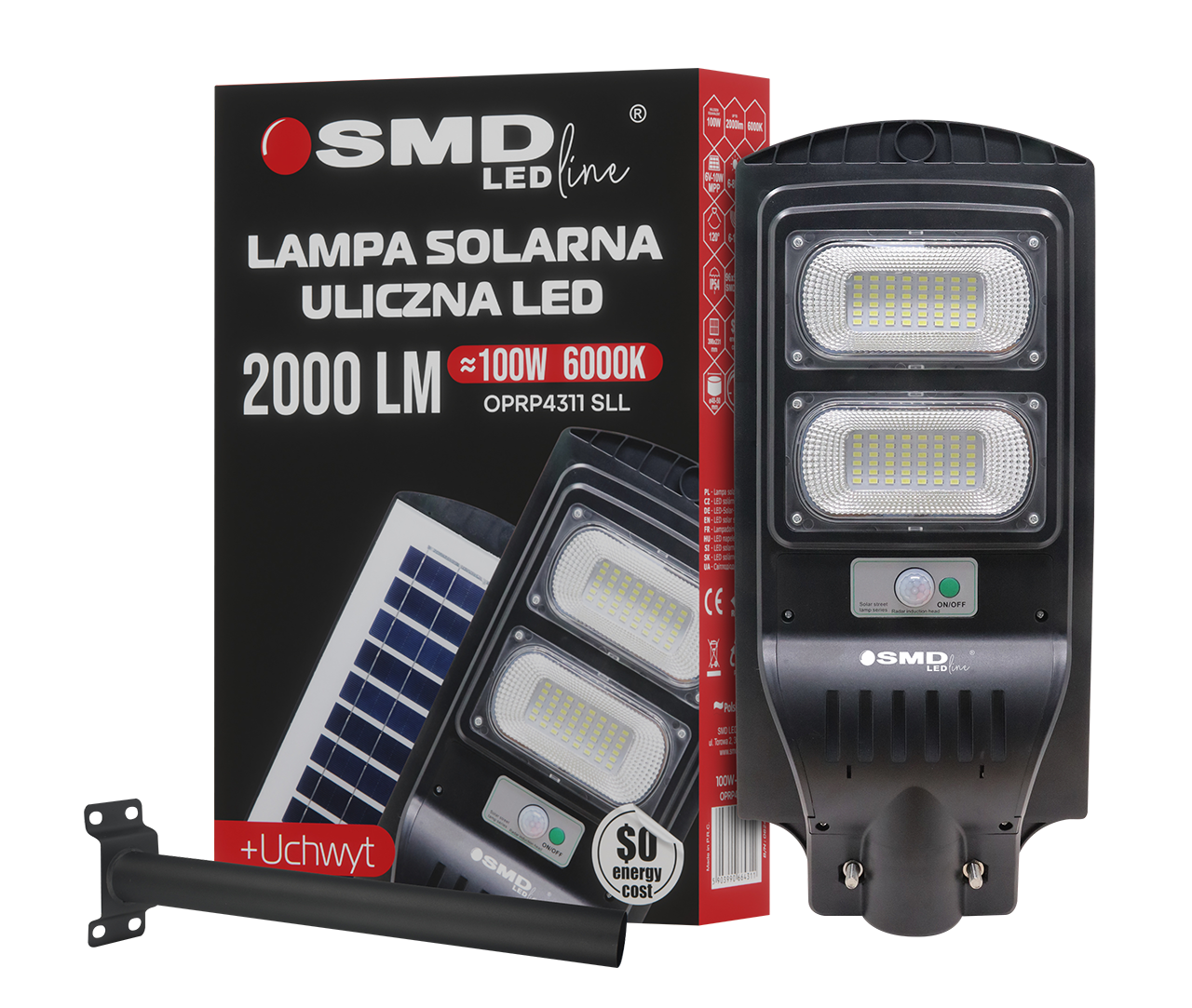 Lampa uliczna solarna LED 100W marki SMD LEDline to energooszczędne i nowoczesne źródło światła, idealne do oświetlania ogrodów, posesji, bram wjazdowych, placów, parkingów czy dróg. Dzięki zasilaniu energią słoneczną eliminuje potrzebę skomplikowanej instalacji elektrycznej oraz gwarantuje zerowe koszty eksploatacji.
