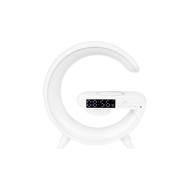 Lampka biurkowa w nowoczesnym kształcie litery „G” łączy w sobie funkcję oświetlenia, głośnika Bluetooth, budzika oraz ładowarki indukcyjnej QI. To wielofunkcyjne urządzenie idealnie sprawdzi się na biurku, stoliku nocnym czy w pokoju młodzieżowym, zapewniając światło, muzykę i wygodę ładowania w jednym.