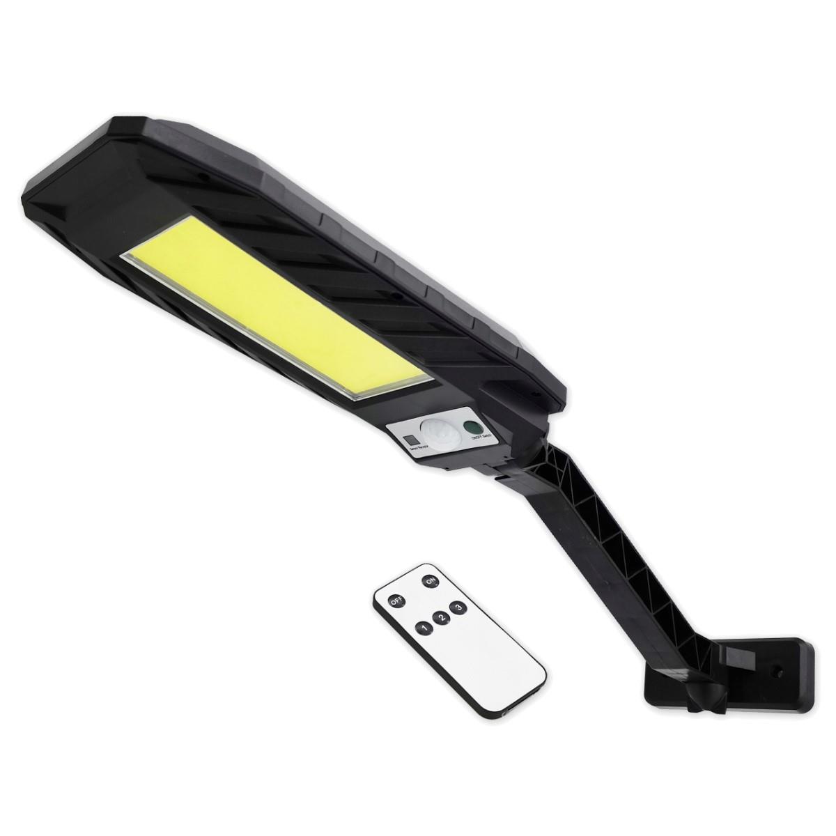 Naświetlacz LED o mocy 10W zasilany energią solarną, wyposażony w czujnik zmierzchu i czujnik ruchu PIR oraz pilot IR do sterowania.